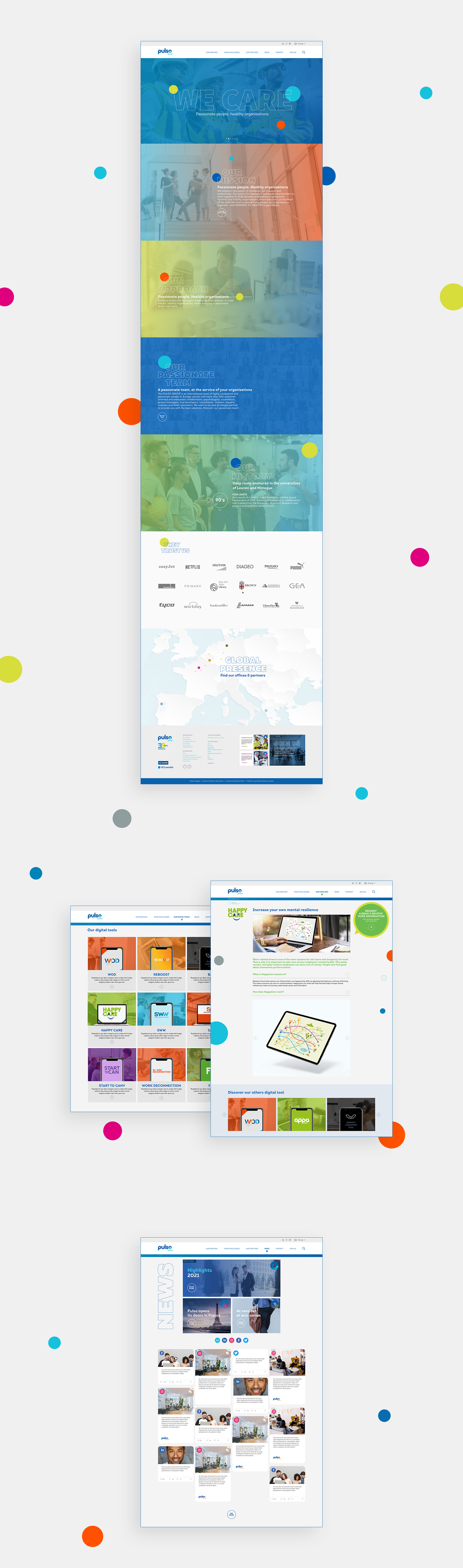C'est dans ce contexte que j'ai accompagné Pulso dans la création de leur nouveau logo et d'une charte graphique déclinable pour chaque pays. Dans la continuité de ce renouveau, un site destiné à la présentation du groupe a été créé.